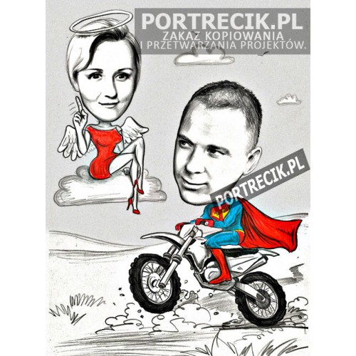 Karykatura motocyklisty - supermena na motorze, w tle na chmurce kobieta, która grozi palcem :) Pomysł na karykaturę z motocyklem cross / enduro