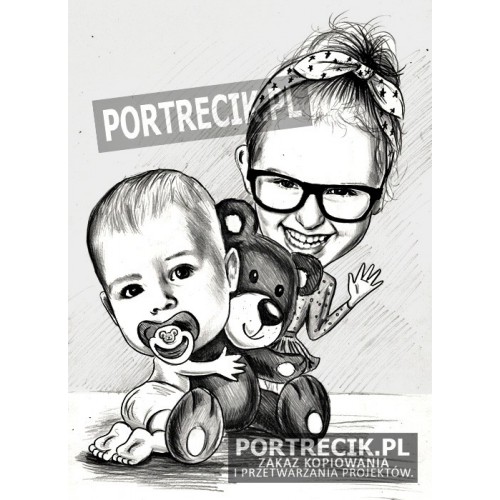 Karykatura dzieci - rodzeństwo z misiem