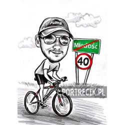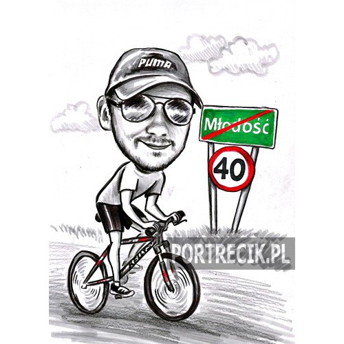 Karykatura rowerzysty na czterdzieste urodziny. Pomysł na karykaturę dla pasjonata rowerów - w tym przypadku karykatura urodzinowa na 40tkę
