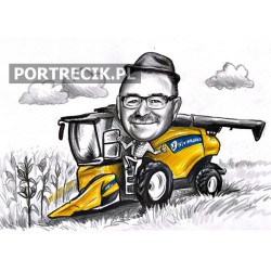 Karykatura rolnika w kombajnie. Kombajnista zbierający kukurydzę kombajnem New Holland. Żółte akcenty ożywiają rysunek.
