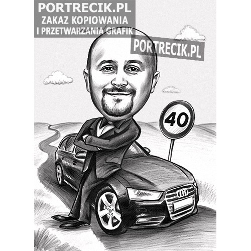 Karykatura mężczyzny przy aucie - Mercedes. Możliwość zamiany na dodolną inną markę - BMW, Audi, volkswagen itp.