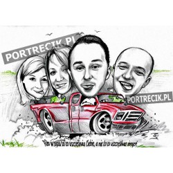 Dobry pomysł na karykaturę kilku znajomych na jednym rysunku, grupa siedzi w aucie typu pick-up.