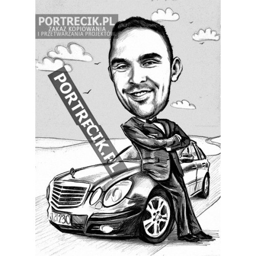 Karykatura mężczyzny przy aucie - Mercedes. Możliwość zamiany na dodolną inną markę - BMW, Audi, volkswagen itp.