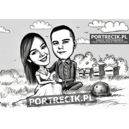 Karykatura ślubna pszczelarza w stroju militarnym, kobieta w białej sukni, a w tle ule