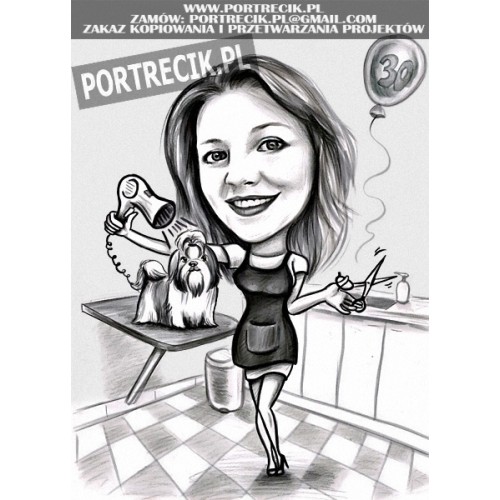 Karykatura biurowa - kobiety siedzącej przy biurku przy komputerze. Karykatura zrealizowana dla prawcownicy biura, jednak projekt pasuje także na karykaturę urzędnika lub urzędniczki, sekretarki itp.