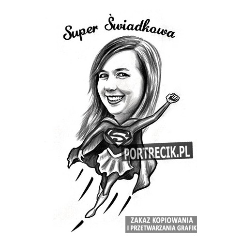 Karykatura dla świadkowej - świadkowa jako superwoman z peleryną, na górze napis SUPER ŚWIADKOWA.