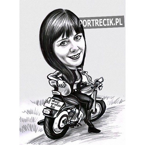 Karykatura motocyklistki z dedykacją na tablicy rejestracyjnej: "z okazji 33 urodzin".
