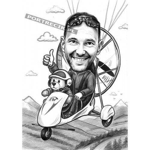 Karykatura przedstawia paralotniarza. W góry i chmury. Dobry pomysł na prezent dla fana paralotni / motoparalotni.