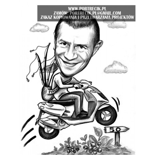 Karykatura wędkarza na skuterze. W plecaku ma wędki, skuter pędzi przez krzaki jagód. Obok znak ograniczenia do 50.