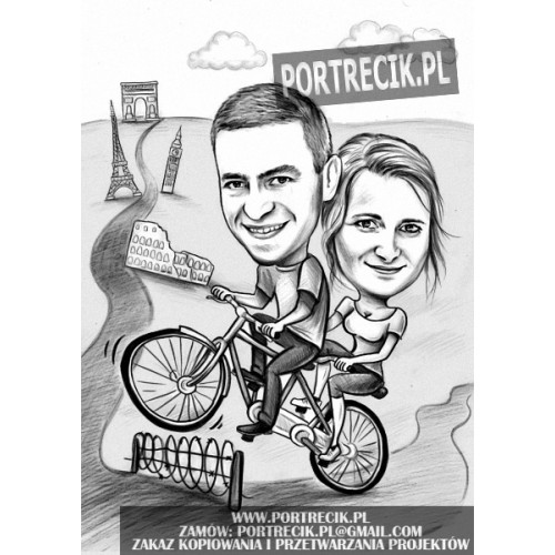 Karykatura pary jadącej rowerem typu tandem. Rower przeskakuje przez symboliczny drut kolczasty, w tle słynne europejskie zabytki, będące nawiązaniem do podróży.