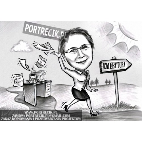 Karykatura kobiety rzucającej za siebie papiery, pozostawiającej biurko, uciekającej w stronę słońca i emerytury. Pomysł idealny dla pracownika biura, urzędnika itp.