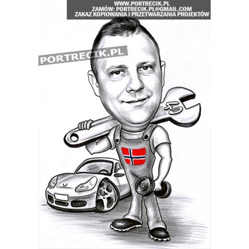 Karykatura mechanika samochodowego z okazji osiemnastych urodzin. Młody mechanik stoi z ogromnym kluczem ubrany w markowe spodnie, w tle samochód czekający na serwis.