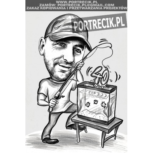 Karykatura wędkarza łowiącego ryby w... akwarium. W ręku ma wędkę, na którą właśnie łapie liczbę 40. Dobry pomysł na karykaturę dla wędkarza z poczuciem humoru :)